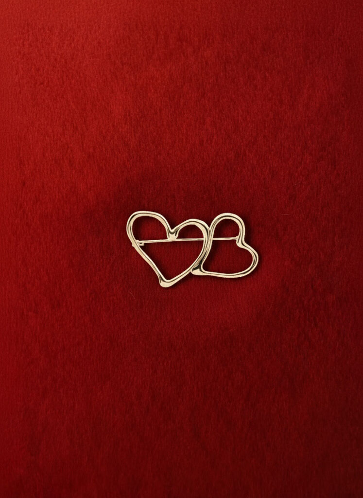 From that sketch came the first piece, the Pulse Brooch — two hearts fused into one continuous line. Then the line kept moving, becoming sculptural pendants, double necklaces and finally mono earrings that echo the same flowing shape. These are hearts seen from the inside out: abstract, modern and slightly imperfect, more about connection than cliché.
